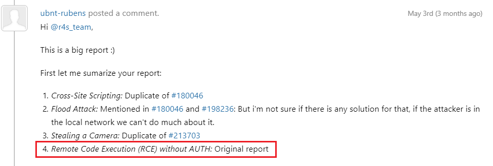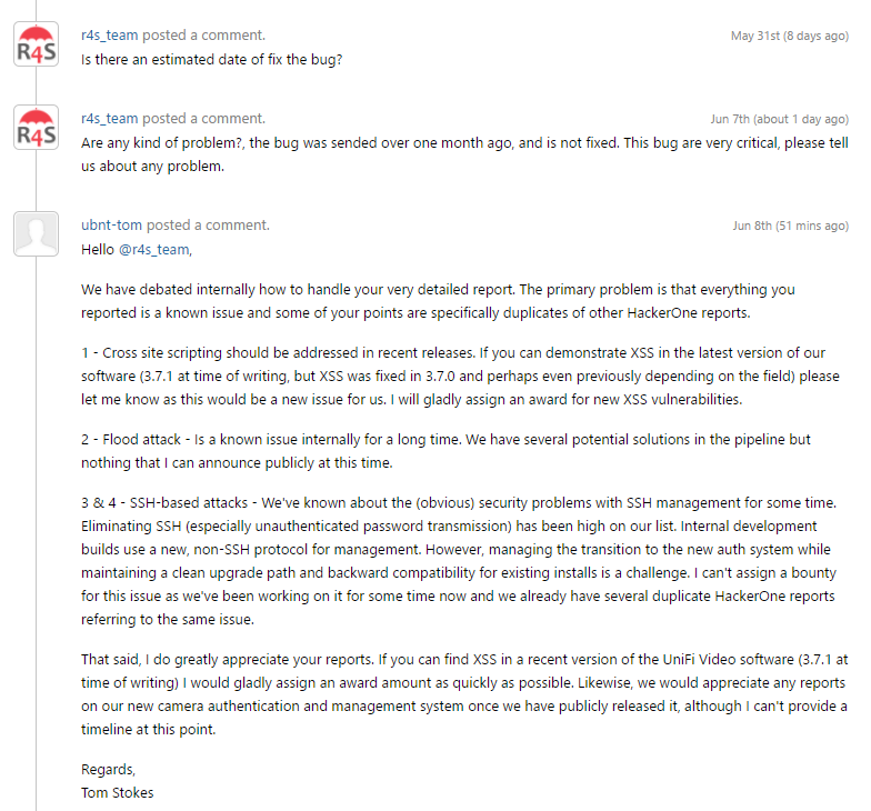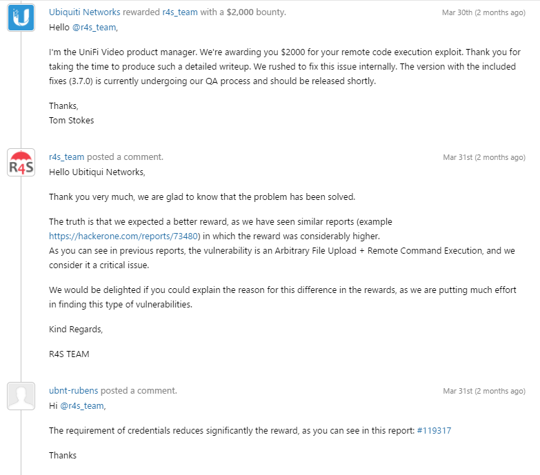 Lo que vengo a contar mas que una entrada típica, es mas bien una experiencia personal con un BugBounty de HackerOne (con la empresa de Ubiquiti). Nuestra relación iba de maravilla, prueba de ello es que toda la reputación adquirida ha sido gracias a los fallos que los hemos enviado a lo largo de 4 meses. (Podéis consultar el perfil aquí https://hackerone.com/r4s_team)
