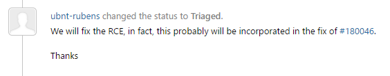 Su respuesta fue rápida, todos eran duplicados menos el RCE, y fue marcado como triage con la siguiente respuesta