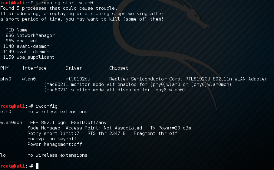 - Airmon-ng: Es un script bastante simple que permite activar/desactivar el modo monitor de una tarjeta de red, además de otras funciones de control sobre ella.