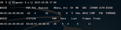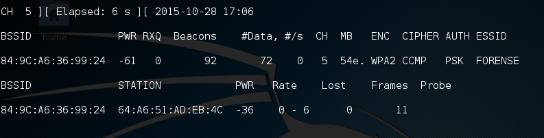 - Airodump-ng: Su utilidad principal es la de capturar paquetes dentro de una red WiFi, además de mostrar diversos datos acerca de las redes inalámbricas que detecta y los host que pueden estar conectados a ellas o simplemente a la escucha.