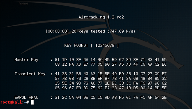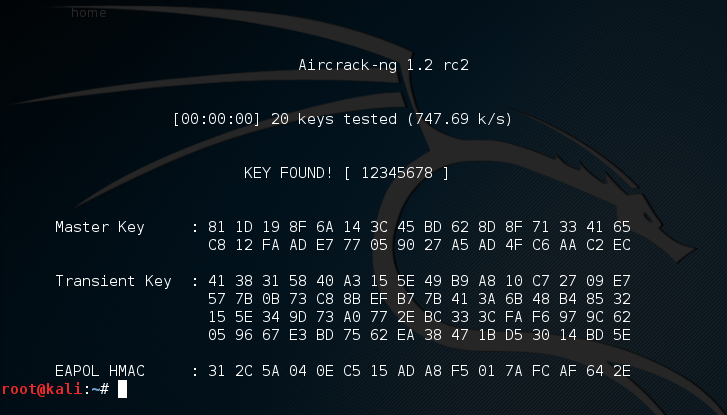 Y rápidamente (colocamos una clave bastante evidente, así que se encuentra pronto en el diccionario) nos desvela la clave de la red inalámbrica cifrada en WPA2-PSK, uno de los algoritmos más seguros actualmente.