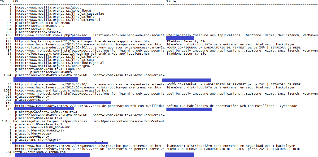 Si en el PC que se va analizar tuviera abierto Firefox, con el siguiente comando se exportaría las urls que tuviera abiertas en ese momento así como todas las descargas que hubiera hecho y el historial de sitios web vistos: