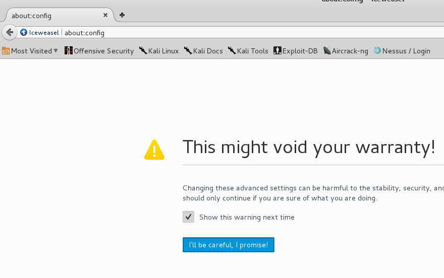 Si queremos usar Firefox para navegar anonimamente, teclearemos en la barra de dirección «about config«, nos saldrá un aviso de que tengamos cuidado con lo que vamos a cambiar, aceptamos y estramos en la configuración del navegador, localizamos donde dice «network.proxy.socks_remote_dns = TRUE» y acto seguido configuramos nuestra configuración de acceso en el navegador: