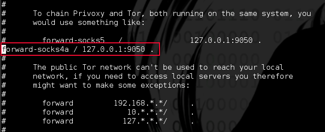- agregar la línea «forward-socks4a / 127.0.0.1:9050 .» (el . incluido) (9050 es el puerto usado por tor).