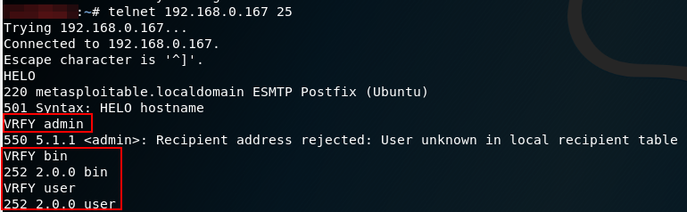 Se cuenta con tres comandos interesantes como VRFY, EXPN y RCPT TO que pueden ser empleados para enumerar posibles usuarios registrados en el servidor de correo.