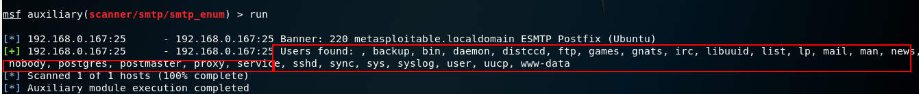 Metasploit cuenta con el módulo auxiliar: /scanner/smtp/smtp_enum para enumerar usuarios. Por defecto, lo realiza con el diccionario /usr/share/metasploit-framework/data/wordlists/unix_users.txt