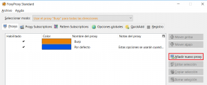 En mi caso ya tengo configurado el proxy de burp (color naranja), pero simplemente debemos añadir un nuevo proxy: