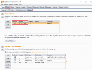 Para ello, abrimos Burp Suite y accedemos a la pestaña Proxy -> Options y nos aseguramos que la opción Running esté marcada y seleccionamos el puerto que queramos utilizar (por defecto 127.0.0.1:8080).