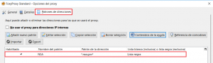 Por último, FoxyProxy nos permite añadir o eliminar direcciones para las que se usará el proxy (listas blancas/listas negras). Como ejemplo, he añadido cualquier dominio de la NSA a la lista negra (no queremos que nos vengan a buscar :D).