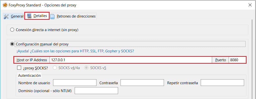 En la pestaña Detalles, seleccionamos el host o IP y el puerto (recordar usar la misma que pusimos en Burp Suite).