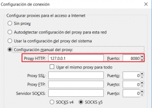 En configuración manual del proxy, ponemos localhost (127.0.0.1) y puerto 8080 (esta configuración debe ser la misma que hemos puesto en el proxy de Burp Suite).