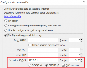 Lo primero que debemos saber es el puerto en el que recibe el servidor TOR la conexión. Para ello abrimos el navegador TOR Browser, accedemos a Preferencias -> Avanzado -> Red -> Configuración y observamos que la IP es 127.0.0.1 (loopback), puerto 9150 y tipo SOCKSv5.