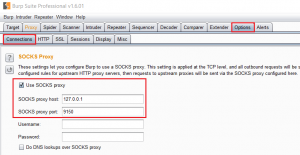 Ahora deberemos replicar esta configuración en Burp Suite, para ello accedemos a Options -> Connections y configuramos de nuevo IP:Puerto, marcando la opción Use SOCKS proxy