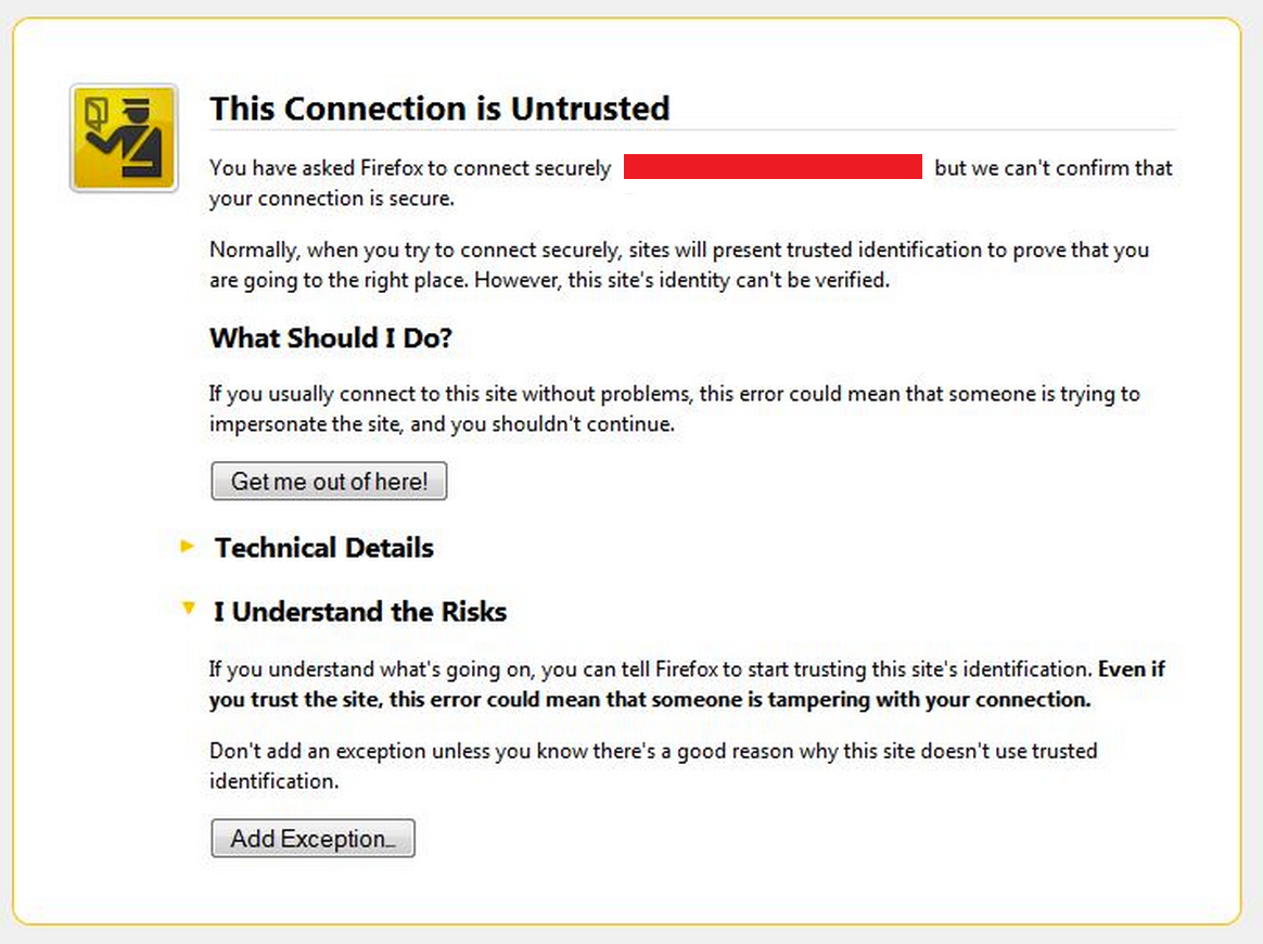 La configuración que tenemos hasta ahora, nos permite navegar por cualquier web independientemente del protocolo que utilice (HTTP/HTTPS), sin embargo, en el caso de acceder a una web que utilice protocolo HTTPS, el navegador (Firefox en este caso), nos avisará que la página no es confiable y nos obligará a añadir la excepción cada vez que utilicemos este protocolo (lo cual es un coñazo).