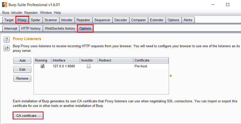 Para solucionar este problema, deberemos exportar el certificado de Burp Suite al navegador. Para ello, primero obtendremos el certificado desde nuestro Burp Suite accediendo a la pestaña Proxy -> Options y pulsando en CA CERTIFICATE.