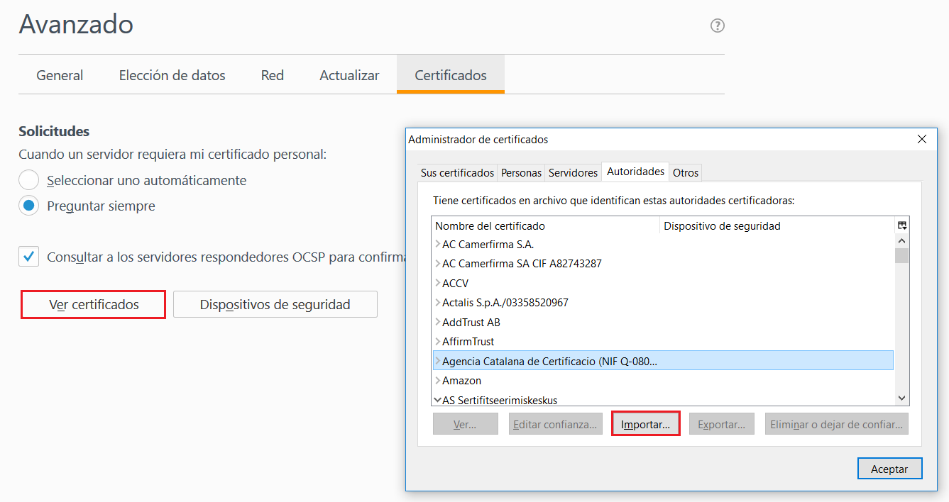 Ahora solo queda importarlo en el navegador , para ello abrimos el navegador y vamos a Preferencias -> Avanzado -> Ver certificados -> Importar y seleccionamos el certificado previamente guardado….problema resuelto!