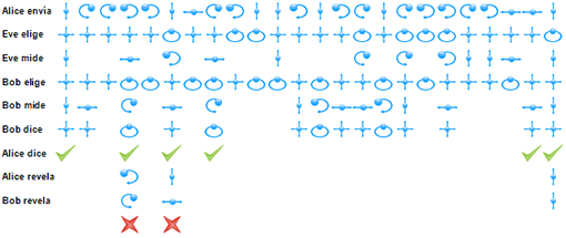 - Alice y Bob descartan todas las observaciones en las que no se eligió la base correcta.