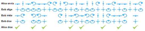 Bob decide aleatoriamente si va a realizar una medición rectilínea o circular para cada fotón que Alice envié. La secuencia elegida es: