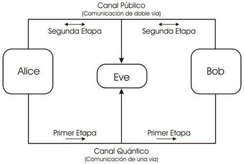 A partir de de este momento se hará uso de los nombres Alice, Bob y Eve para referirse respectivamente al emisor, al receptor y a quien escucha secretamente los mensajes de una comunicación.