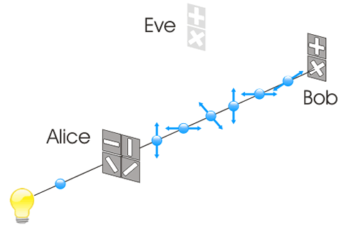 Si Eve intenta espiar la secuencia de fotones, al no conocer de antemano si la polarización del próximo fotón es diagonal o rectilínea, no podrá medirlo sin correr el riesgo de perturbarlo de tal forma que se introduzca un error.