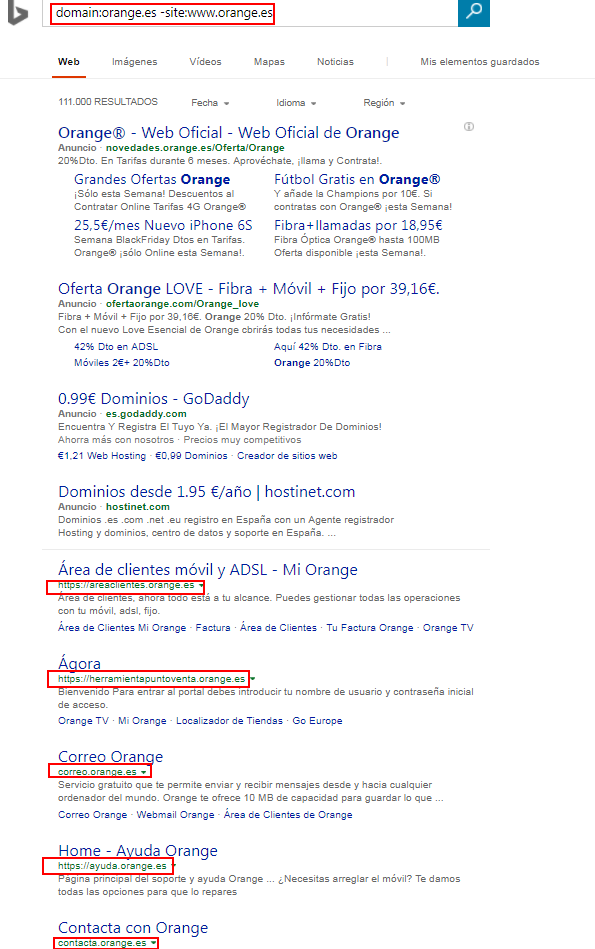 En primer lugar, vamos a ver Bing, que si ya habéis leído alguno de mis anteriores post’s, Bing cuenta con el dork «domain» para listar todos los subdominios de un dominio principal:
