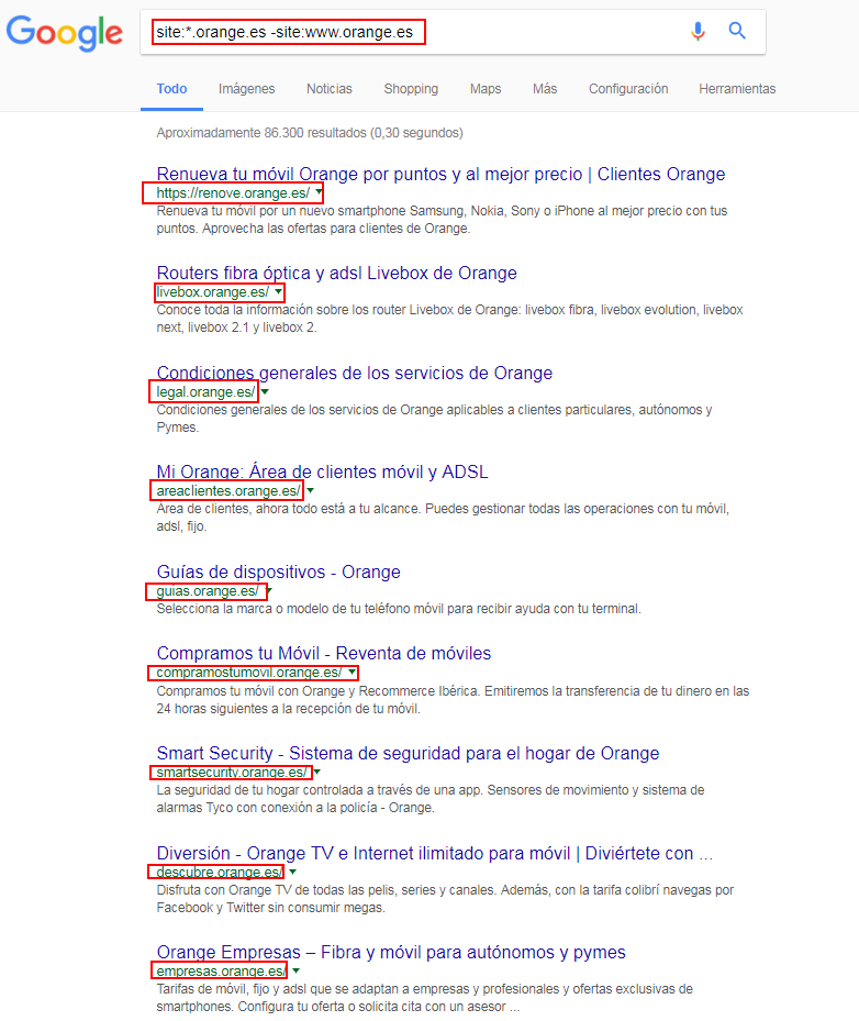 Para que quede claro, si el dominio es: orange.es el nombre del dominio sería orange, de tal manera, que cualquier dominio que contenga como nombre de dominio el keywork «orange» debería aparecer siempre y cuando Google, lo tenga indexado.