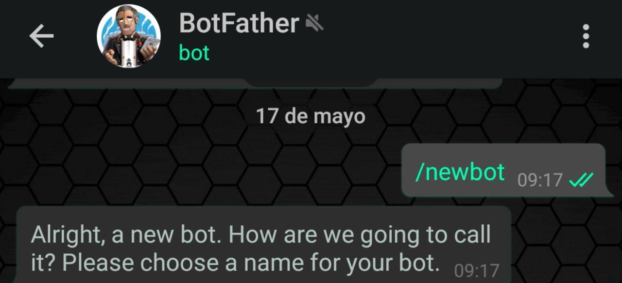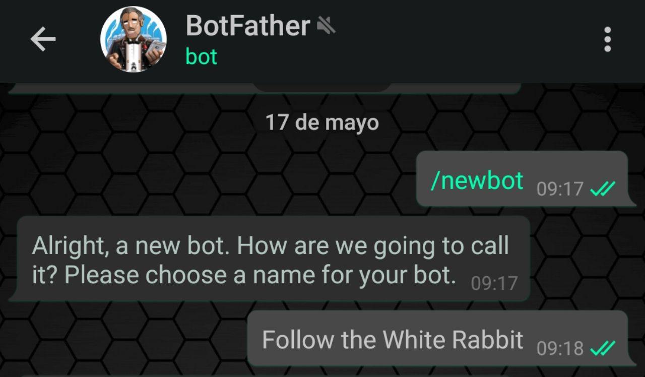 Una vez hecho hecho, escribiremos /newbot para comenzar el proceso de creación de nuestro bot.