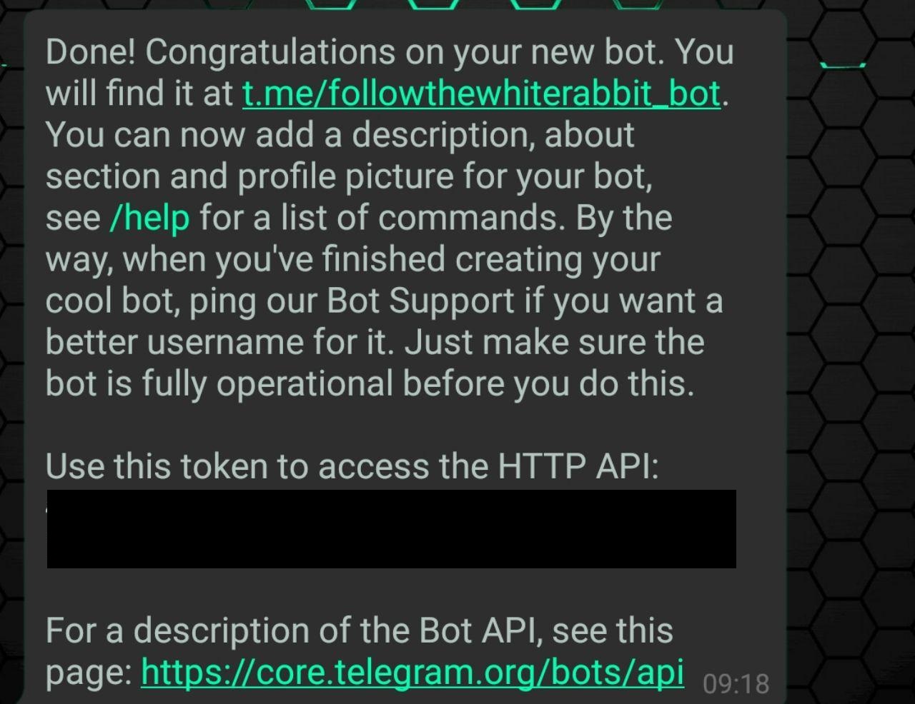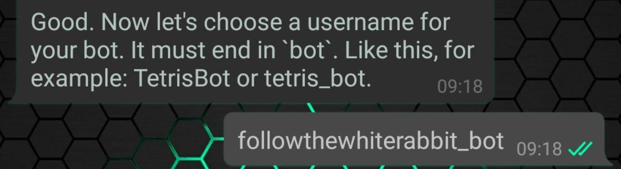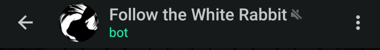 Para que un BOT pueda enviar mensajes a un usuario, éste deberá haberlo iniciado anteriormente, para ello, accedemos a nuestro bot buscándolo por su nombre (con @ delante) o bien utilizando el link que BotFather nos ha proporcionado (http://t.me/NOMBREDETUBOT) en nuestro caso sería URL: http://t.me/followthewhiterabbit_bot