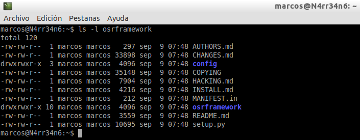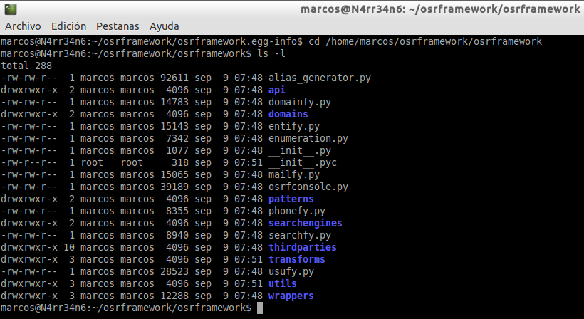 Ahora, si ingresamos en el segundo directorio de ‘osrframework’ y lo listamos, observaremos los módulos de la herramienta