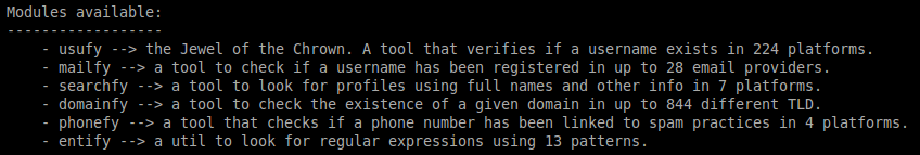 Se trata de un framework para la investigación de usuarios en fuentes abiertas, capaz de buscar datos en 223 plataformas distintas, entre otras funcionalidades. No usa APIs de las plataformas, (salvo en Skype porque hay que darle permisos), si no que se basa en una aproximación de la url. Extrae la información de una forma automática. Y es de código abierto.