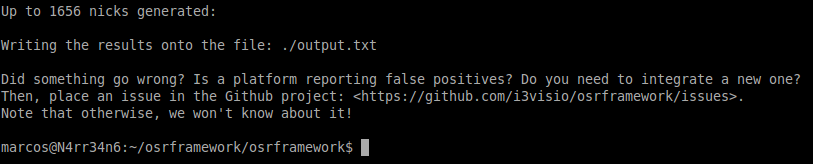 ¡Casi nada! 1656 nicks generados, en un fichero de texto con nombre ‘output’. Son demasiados, para mostraros el poder de este framework.
