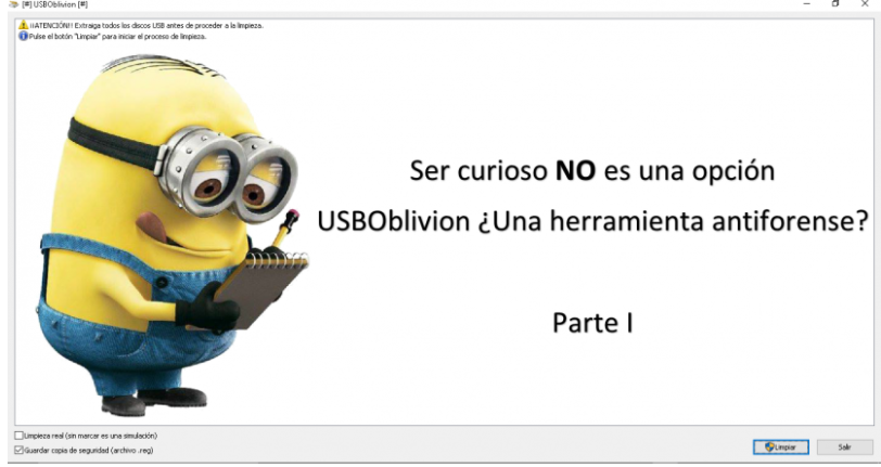 La ponencia de @_n4rr34n6_ estaba orientada en la rama de forense, simulando un posible caso de fuga de información en el que se había empleado la herramienta anti-forense «USBOblivion».