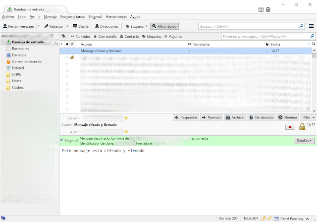 Podemos hacer una prueba muy simple mandándonos a nosotros mismos un mensaje cifrado y firmado, comprobando que Thunderbird, que ya tiene nuestras claves, puede verificar la autenticidad del mensaje y descifrar su contenido. Al recibir el mensaje, se nos ofrecerá la opción de descifrarlo (Reparar mensaje) con nuestra clave privada introduciendo nuestra contraseña para ello, y podremos leer el contenido.