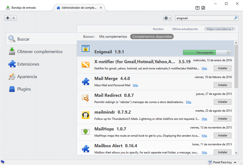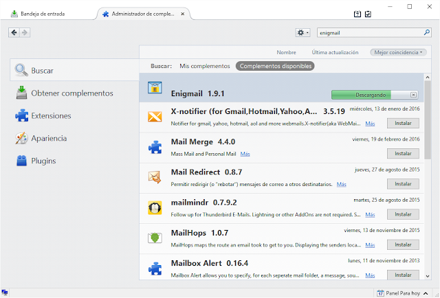 Thunderbird es un cliente de correo electrónico que nos permite recibir y enviar correos con nuestras cuentas de hotmail, gmail, yahoo y prácticamente cualquier otro proveedor. Es de código abierto y permite la instalación de extensiones que ofrecen diversas funcionalidades. En este caso, partiendo de una instalación de Thunderbird ya configurada con nuestra cuenta de correo electrónico (el proceso de instalación y configuración es muy rápido y sencillo).