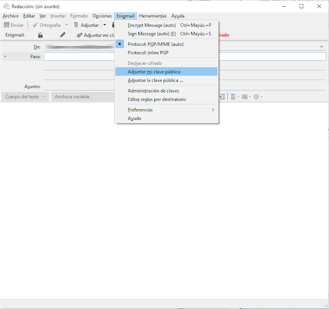 Además, podemos cifrar el mensaje con la clave pública del destinatario, con el objetivo ya descrito anteriormente de proteger el contenido del mensaje, dado que solamente el destinatario podrá leerlo. En caso de no tener guardada la clave pública del destinatario, se nos pedirá que la importemos (a veces se nos pedirá elegirla aunque esté ya importada). Tanto el firmado como el cifrado se pueden realizar con los botones correspondientes que aparecen en la ventana de redacción de correos (el lápiz y el candado).