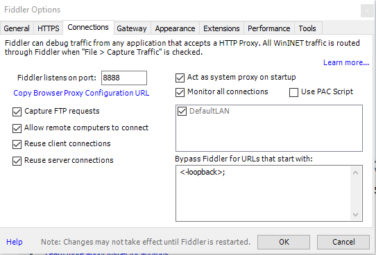Abrimos el Fiddler (http://www.telerik.com/fiddler) (i love fiddler) y lo configuramos de forma que escuche peticiones a ese puerto.