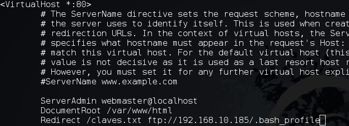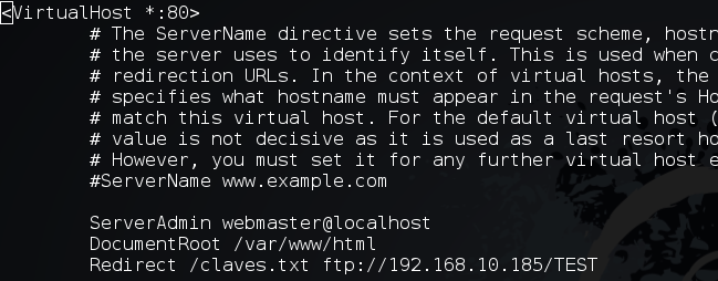 Ahora configuramos una redirección simple en Apache que redirija las peticiones de claves.txt al archivo que hemos alojado en nuestro FTP.