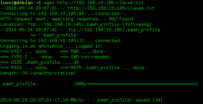 Ahora cuando la victima ejecute wget contra el archivo claves.txt se crea un archivo .bash_profile con una Shell que se ejecutará en cada inicio.