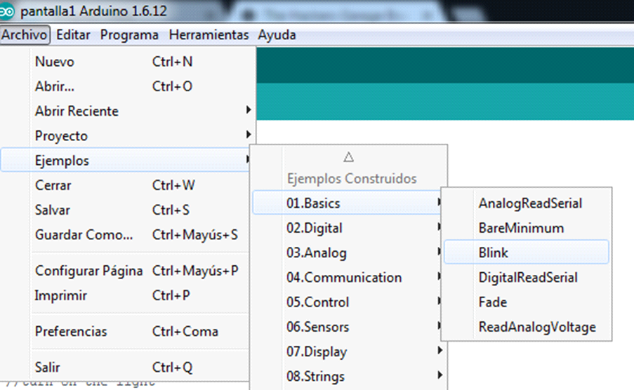 Y cargamos el script BLINK en el programa el cual viene ya pre-cargado como modulo de ejemplo.