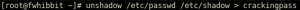 El primer paso será unificar ambos ficheros en uno. Para ello usaremos la utilidad unshadow, que pertenece a John The Ripper. El funcionamiento es muy sencillo, usamos el comando anteriormente mencionado seguido de ambos directorios, además de establecer un fichero nuevo de salida: