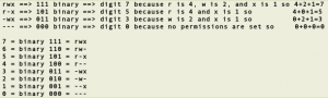 Como mencioné anteriormente, este método puede resultar más complicado de entender al principio; o al menos un poco más dificil de recordar. Los permisos (rwx) son representaciones de un valor binario que, por supuesto, entiende nuestra máquina. Entendiendo entonces que cada trío de permisos tendría un valor binario (rwx == 111, r-x == 101, r– == 100…) que siendo convertido a octal, nos daría un dígito entre 0 y 7.