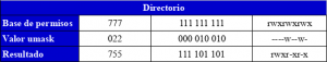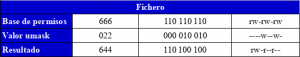 Ya conocemos cómo interpretar y editar permisos. A continuación veremos cómo configurar los permisos por defecto con umask. Volvemos al octal; por defecto, los directorios tienen una base octal de 777 (111 111 111)(rwx rwx rwx) mientras que los ficheros de 666 (110 110 110)(rw- rw- rw-). La razón por la que los ficheros carecen de permisos de ejecución es sencilla, por seguridad, no conviene que le demos este permiso a todo archivo nuevo. Partiendo de esta base, la operación para determinar los permisos de creación de nuevos archivos y directorios es la resta del valor dado por umask al permiso base.