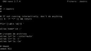 La segunda y tercera opción son «permanentes»; se mantendrá mientras se mantengan los ficheros de configuración. La segunda opción afectará al usuario propietario del fichero de configuración .bashrc. En este caso sólo afectará al usuario hombre mientras que el usuario mujre tendrá su propio fichero .bashrc en su directorio personal, aunque de estos ficheros y directorios hablaremos más adelante.