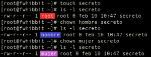 Como vimos anteriormente, para cada archivo o directorio no sólo tenemos unos permisos asociados, sino un usuario y un grupo propietarios del mismo. Para cambiar el propietario utilizaremos chown. Como vemos a continuación, podemos ir cambiando el propietario de nuestro ‘secreto’. De la misma forma si quisiéramos cambiar propietarios a los directorios.