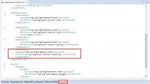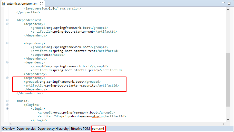 Para securizarlo usaremos el módulo de Spring security, con la dependencia siguiente (a través de Maven) que podemos añadir manualmente en el fichero pom.xml que se encuentra en el proyecto: