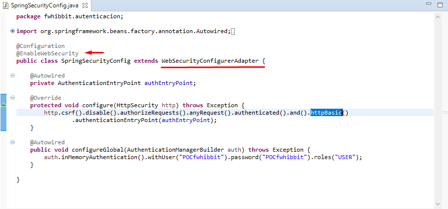 La primera clase es SpringSecurityConfig.java. Usamos la etiqueta @EnableWebSecurity para disponer de la parte de Spring security, y extendemos la clase de WebSecurityConfigurerAdapter para poder sobrescribir las características a nuestro antojo sobre una autenticación HTTP básica.