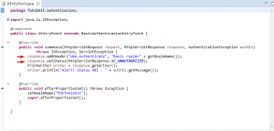 Esta clase es la encargada de devolver la respuesta cuando los credenciales no son los correctos. En este caso devolverá “Alert! Status 401 – “ más el mensaje correspondiente que genera.