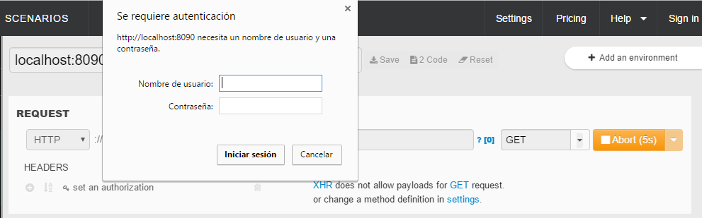 Ahora, para hacer uso del servicio, tenemos que introducir unos credenciales (que definimos más arriba).