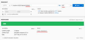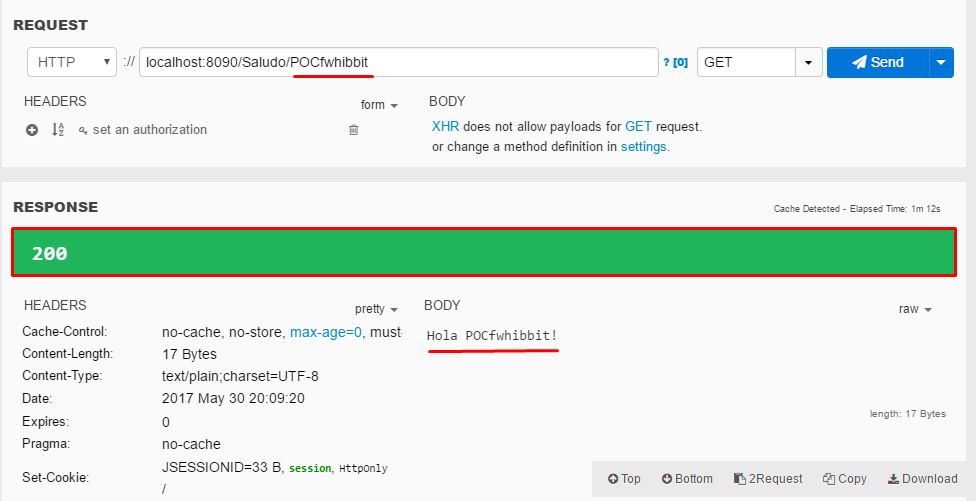 Con “…” me refiero a la dirección donde se encuentre alojado el servicio, en este ejemplo y dado que Spring boot incorpora un servidor local embebido, será del tipo “http://localhost:8080/Saludo/{name}